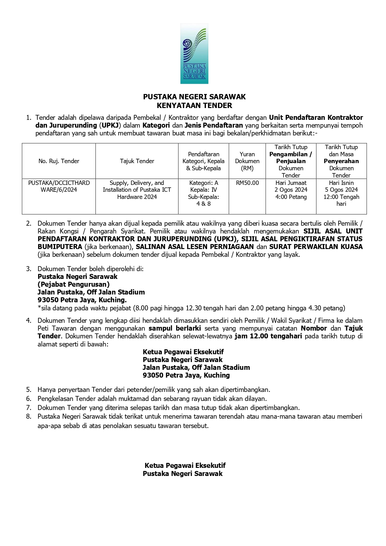 | Tender Notice : Supply and Delivery of Information Resources & Materials to Pustaka Negeri Sarawak |